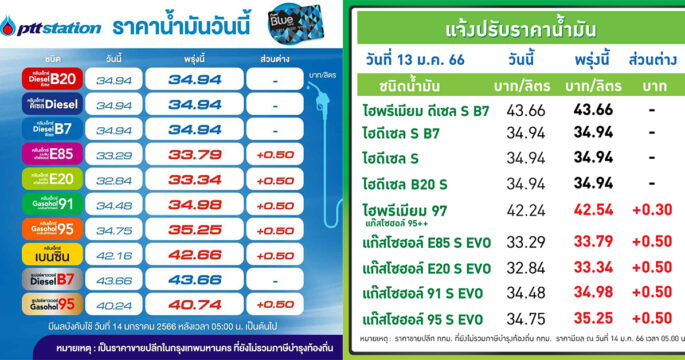 PTT Station -บางจากฯ ปรับราคาขายปลีกน้ำมันกลุ่มเบนซินและแก๊สโซฮอล์ทุกชนิดขึ้น 60 สตางค์/ลิตร มีผล 20 ม.ค. 2566 เวลา 05.00 น. เป็นต้นไป