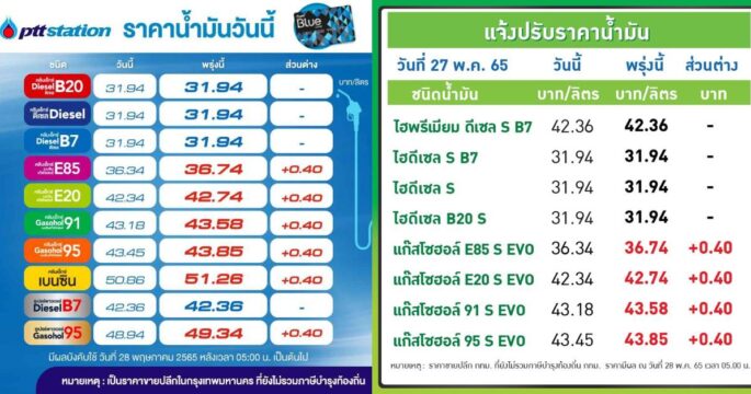 ผู้ค้าแจ้งปรับขึ้นราคาน้ำมันกลุ่มเบนซินและแก๊สโซฮอล์ 40 สตางค์/ลิตร ส่วนกลุ่มดีเซลคงเดิม มีผลพรุ่งนี้ (5 พ.ย.65)