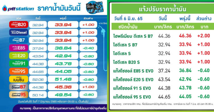 PTT Station-บางจากฯ ปรับลดราคาขายปลีกน้ำมันกลุ่มเบนซินและแก๊สโซฮอล์ทุกชนิดลง 60 สตางค์ต่อลิตร เว้น E85 ลดลง 40 สตางค์ต่อลิตร ส่วนกลุ่มดีเซลทุกชนิดปรับขึ้น 1.00 บาทต่อลิตร มีผล 7 มิ.ย.65 เวลา 05.00 น. เป็นต้นไป