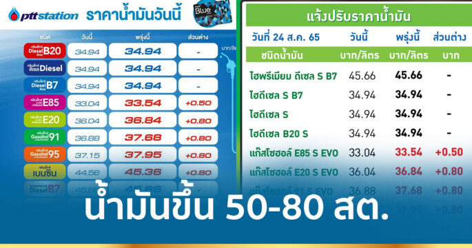 แวะปั๊มเลย! พรุ่งนี้ (25 ส.ค.) น้ำมันกลุ่มเบนซินและแก๊สโซฮอล์ทุกชนิดปรับขึ้น 80 สตางค์ เว้น E85 ขยับ 50 สตางค์ ส่วนดีเซลราคาคงเดิม มีผลเวลา 05.00 น. เป็นต้นไป