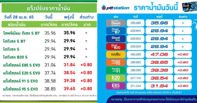 PTT Station -บางจากฯ ปรับราคาน้ำมันกลุ่มเบนซิน-แก๊สโซฮอล์ทุกชนิดขึ้น 80 สต./ลิตร ส่วนกลุ่มดีเซลราคาคงเดิม มีผล 29 เม.ย.65 เวลา 05.00 น. เป็นต้นไป