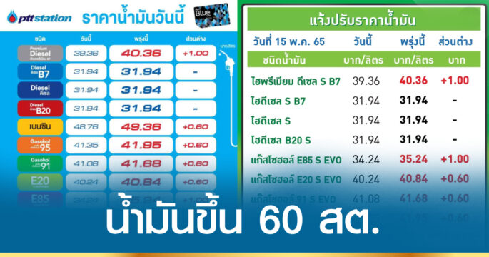 PTT Station และบางจากฯ ปรับขึ้นราคาขายปลีกน้ำมันกลุ่มเบนซินและแก๊สโซฮอล์ทุกชนิด 60 สตางค์/ลิตร ยกเว้น E85 และน้ำมันดีเซลพรีเมียม ปรับขึ้น 1 บาท/ลิตร ส่วนกลุ่มดีเซลทุกชนิดคงเดิม มีผลพรุ่งนี้ (16 พ.ค.65) เวลา 05.00 น. เป็นต้นไป