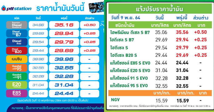 PTT Station-บางจากฯ ปรับราคาขายปลีกน้ำมันกลุ่มดีเซล ทุกชนิดขึ้น 25 สตางค์ต่อลิตร เว้นดีเซลพรีเมียม B7 ปรับขึ้น 50 สตางค์ต่อลิตร ส่วนกลุ่มเบนซิน-แก๊สโซฮอล์ทุกชนิด คงเดิม มีผล 10 พ.ย.64 เวลา 05.00 น. เป็นต้นไป
