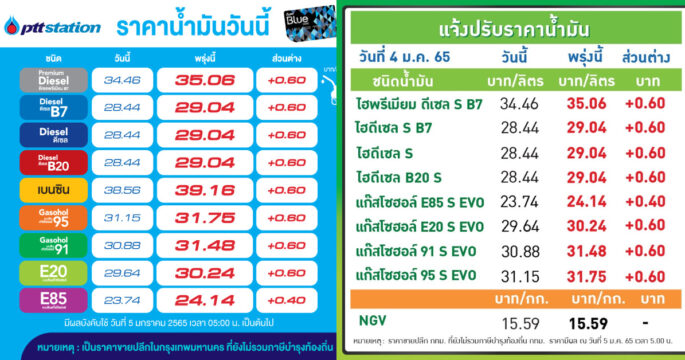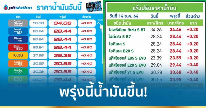 PTT Station ปรับราคาขายปลีกน้ำมันกลุ่มเบนซินและแก๊สโซฮอล์ทุกชนิดขึ้น 40 สตางค์/ลิตร เว้น E85 ปรับขึ้น 20 สตางค์/ลิตร ส่วนกลุ่มดีเซลทุกชนิด ปรับขึ้น 20 สตางค์/ลิตร มีผล 15 ธ.ค.64 เวลา 05.00 น. เป็นต้นไป