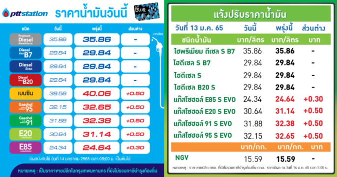 PTT Station และบางจากฯ ปรับราคาขายปลีกน้ำมันเบนซินและแก๊สโซฮอล์ทุกชนิดขึ้น 0.50 บาท/ลิตร เว้น E85 ปรับขึ้น 0.30 บาท/ลิตร ส่วนกลุ่มดีเซลทุกชนิดคงเดิม มีผล 14 ม.ค.65 เวลา 05.00 น. เป็นต้นไป