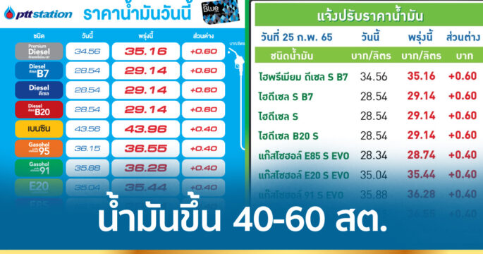 PTT Station แจ้งปรับขึ้นราคาน้ำมันทุกชนิด 40-60 สตางค์/ลิตร มีผลวันที่ 24 ก.พ. 65 ตั้งแต่เวลา 05:00 เป็นต้นไป