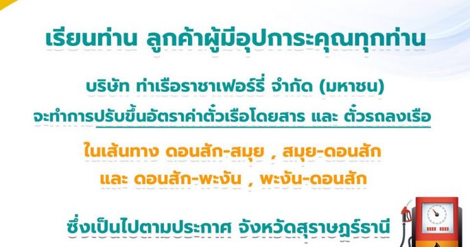 สุราษฎร์ธานี 23 พ.ค.- ปรับขึ้นแล้ว! ค่าโดยสารเรือเฟอรี่ข้ามฟากเกาะสมุยทุกประเภทขยับตามราคาน้ำมันดีเซลพุ่งเกิน 30 บาท ผู้สื่อข่าวรายงานจากจังหวัดสุราษฎร์ธานีกรณีสถานการณ์ของราคาน้ำมันเชื้อเพลิงในระยะนี้มีการปรับตัวสูงขึ้น โดยน้ำมันดีเซลลิตรละกว่า 30 บาทแล้วว่า ล่าสุด (23 พ.ค.) บริษัท ท่าเรือราชาเฟอร์รี่ จำกัด (มหาชน) ประกาศผ่านเว็บไซด์ Raja Ferry Port แจ้งปรับขึ้นค่าโดยสารเรือเฟอรี่ข้ามฟากทุกประเภทเฉลี่ย 5-200 บาท ทั้งตั๋วผู้โดยสารและตั๋วรถลงเรือในเส้นทางดอนสัก-สมุย-ดอนสัก และดอนสัก-พะงัน-ดอนสัก เพื่อให้สอดคล้องกับราคาน้ำมัน และเป็นไปตามประกาศของจังหวัดสุราษฎร์ธานี ซึ่งกำหนดไว้ตั้งแต่ปี 2551 ให้ผู้ประกอบการใช้อัตราค่าโดยสารตามอัตราการขึ้นลงของราคาน้ำมัน สำหรับอัตราค่าโดยสารที่ปรับขึ้น ในส่วนของผู้โดยสารเส้นทางดอนสัก-เกาะสมุย-ดอนสัก จากเดิม 140 บาท ปรับเป็น 150 บาท อัตราค่าโดยสารของรถบรรทุก 10 ล้อ บรรทุกยาวเกิน 1 เมตร จากเดิม 2,200 บาท เพิ่มเป็น 2,400 บาท รถบรรทุก 6 ล้อใหญ่ […]