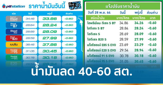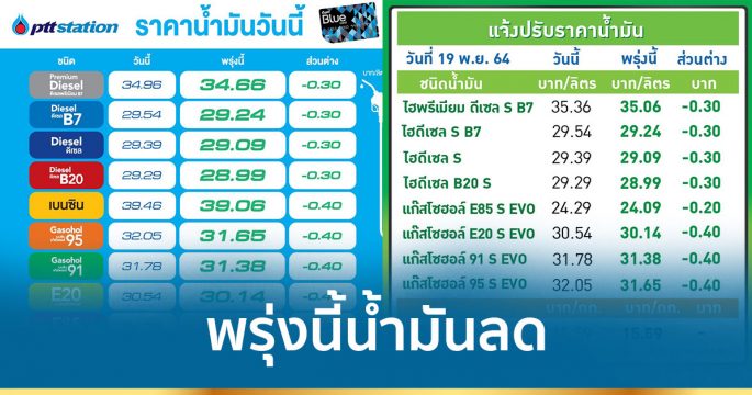 ขยับลงอีก! ผู้ค้าแจ้งปรับลดราคาขายปลีกน้ำมันทุกชนิด 20 – 40 สตางค์ต่อลิตร มีผลพรุ่งนี้ (20 พ.ย.)