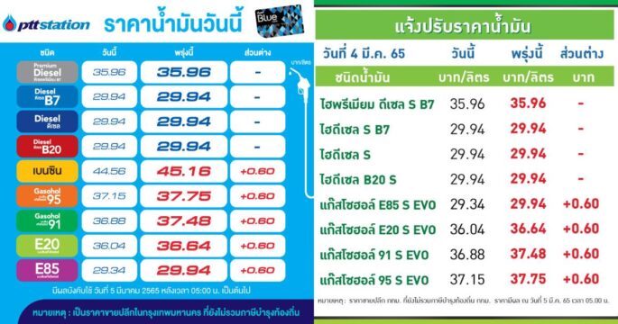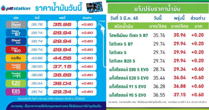 PTT Station บางจาก ปรับราคาขายปลีกน้ำมันกลุ่มเบนซินและแก๊สโซฮอล์ทุกชนิดขึ้น 0.60 บาทต่อลิตร ส่วนกลุ่มดีเซล ทุกชนิดปรับขึ้น 0.20 บาทต่อลิตร มีผล 4 มี.ค.65 เวลา 05.00 น. เป็นต้นไป