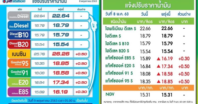 ปตท.-บางจากฯ ปรับขึ้นราคาน้ำมันทุกชนิด 50 สต./ลิตร และปรับลดราคาน้ำมันกลุ่มดีเซลทุกชนิดลง 0.50 บาทต่อลิตร พรุ่งนี้