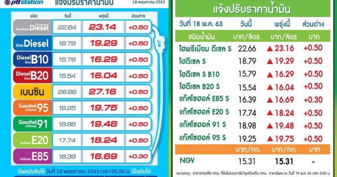 ปตท.-บางจากฯ ปรับราคาขายปลีกน้ำมันทุกชนิดเพิ่มขึ้น 50 สต. ยกเว้น E85 เพิ่ม 30 สต./ลิตร มีผล 19 พ.ค.นี้