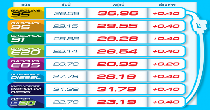 ปตท.-บางจากฯ ปรับขึ้นราคาน้ำมันทุกชนิด 40 สต./ลิตร ยกเว้น E85 ขึ้น 20 สต./ลิตร มีผล 18 พ.ค.นี้