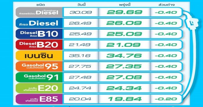 ปตท.-บางจากฯ ปรับลดราคาขายปลีกน้ำมันทุกชนิด 40 สต./ลิตร ยกเว้น E85 ลด 20 สต./ลิตร มีผล 30 เม.ย.นี้