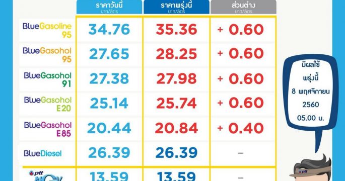 ปตท.-บางจาฯ ปรับขึ้นราคาน้ำมันเบนซิน-แก๊สโซฮอล์ 60 สต. ยกเว้น E 85 ขึ้น 40 สต. ดีเซลคงเดิม มีผล 8 พ.ย.