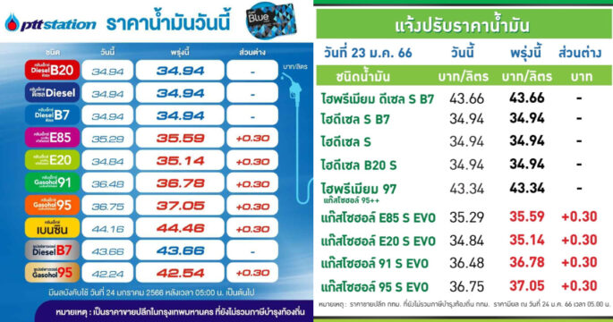 ผู้ค้าแจ้งปรับขึ้นราคาขายปลีกน้ำมันกลุ่มเบนซินและแก๊สโซฮอล์ทุกชนิด 30 สตางค์/ลิตร ส่วนกลุ่มดีเซลคงเดิม มีผลพรุ่งนี้ (24 ม.ค.66) ตั้งแต่เวลา 05.00 น. เป็นต้นไป