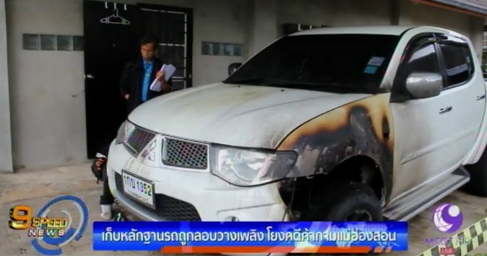 ชุดพิสูจน์หลักฐาน ตรวจสอบสภาพรถยนต์ของนายไฑ ถูกลอบวางเพลิง เจ้าของรถเชื่อเหตุการณ์ดังกล่าวเกิดขึ้นเนื่องจากตนเองสนับสนุนเปิดโปงคดีค้ามนุษย์ในพื้นที่น้ำเพียงดิน