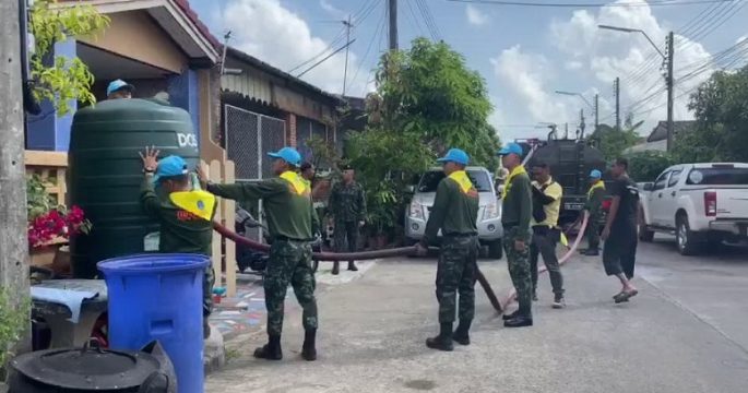 กองทัพภาคที่ 4 พร้อมทหารจิตอาสาพระราชทานส่งรถน้ำเร่งช่วยชาวชุมชนการเคหะนครศรีฯ น้ำประปาไม่ไหลมาเกือบเดือน ชี้ปีนี้แล้งเร็ว และพื้นที่ชุมชนยังอยู่นอกเขตเทศบาลเมือง