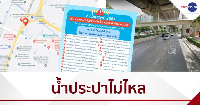 การประปานครหลวง แจ้งมีความจำเป็นต้องหยุดจ่ายน้ำ โรงงานผลิตน้ำสามเสน เพื่อซ่อมท่อบริเวณถนนพระราม 6 ส่งผลให้น้ำประปาไม่ไหลในพื้นที่กรุงเทพฯ ชั้นใน คืนวันเสาร์ที่ 23 ม.ค. ตั้งแต่เวลา 22.00 – 08.00 น. ของวันรุ่งขึ้น