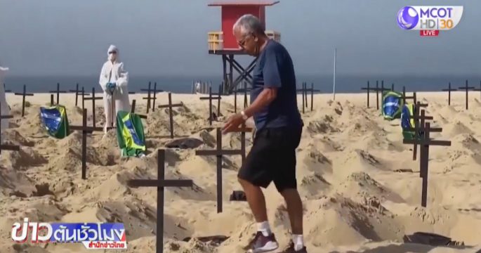 กลุ่มองค์กรท้องถิ่นในบราซิล นำไม้กางเขนจำนวนมากมาปักไว้ริมชายหาดโคปาคาบาน่า เพื่อเป็นสัญลักษณ์ของหลุมศพเหยื่อโควิด-19 และเป็นการประท้วงรัฐบาล