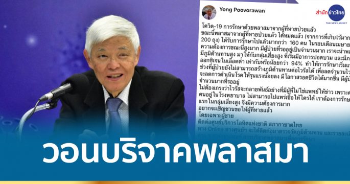 “หมอยง” ชวนผู้ป่วยโควิดที่หายแล้ว แข็งแรงดีช่วยกันบริจาคพลาสมาช่วยผู้ป่วยอาการหนัก ช่วยชาติรอบ 2