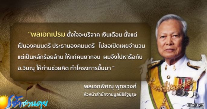 หัวหน้าสำนักงานมูลนิธิรัฐบุรุษและนายทหารคนสนิท เผย “พล.อ.เปรม” ตั้งใจจะบริจาคเงินเดือน ตั้งแต่เป็นองคมนตรี ประธานองคมนตรี โดยไม่ขอเปิดเผยจำนวน แต่เป็นหลักร้อยล้านให้คนยากจน