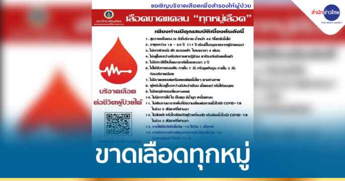 คณะแพทยศาสตร์ศิริราชพยาบาล ขาดแคลนเลือดสำรองทุกหมู่ไม่สามารถให้บริการผู้ป่วยได้อย่างต่อเนื่อง ขอเชิญชวนคนไทยที่มีสุขภาพดีและไม่มีความเสี่ยง ร่วมบริจาคเลือดช่วยชีวิตผู้ป่วยฉุกเฉิน ผู้ป่วยที่รอการผ่าตัด รวมถึงผู้ป่วยโรคเลือดที่จำเป็นต้องใช้เลือด