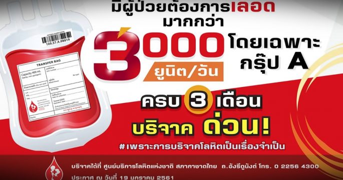 กาชาดขอรับบริจาคเลือดให้ผู้ป่วยมากกว่า 3,000 ยูนิต/วัน โดยเฉพาะกรุ๊ป A