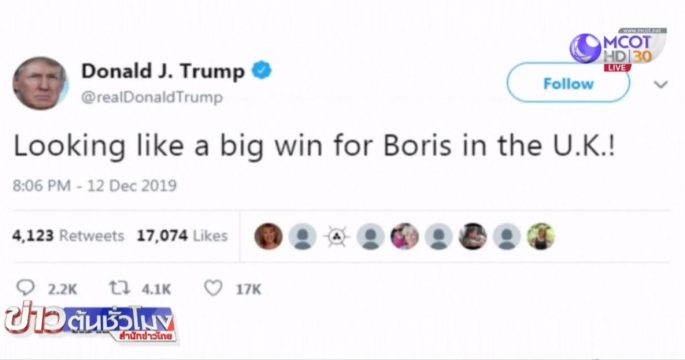 ประธานาธิบดีสหรัฐ โพสต์ทวิตเตอร์ ระบุนายกรัฐมนตรีบอริส จอห์นสัน ได้รับชัยชนะในการเลือกตั้งทั่วไป หลังชาวอังกฤษสนับสนุนแผนผลักดันให้อังกฤษออกจากสหภาพยุโรป