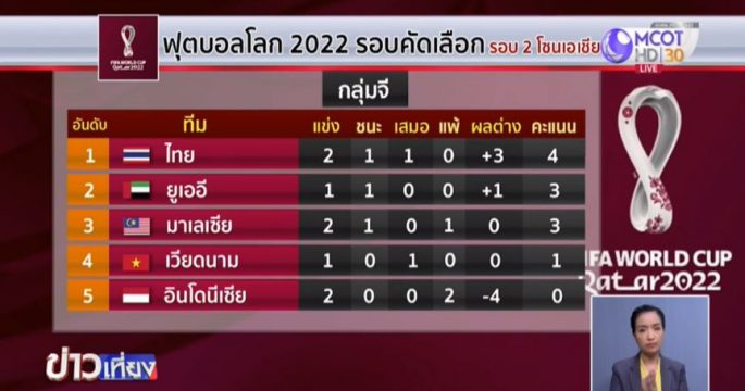 “ธีราทร” พลาดจุดโทษครึ่งแรก ช้างศึก บุกเสมอ เวียดนาม 0-0 ฟุตบอลโลก 2022 รอบคัดเลือก โซนเอเชีย รอบ 2 เวียดนาม ยังนำจ่าฝูงมี 11 คะแนน ส่วนไทยมี 8 คะแนน หล่นไปรั้งอันดับ 3