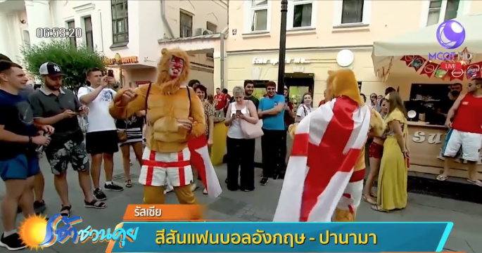 รัสเซีย 25 มิ.ย.-แฟนๆ ชาวอังกฤษหลายคนแต่งตัวเป็นสิงโตเต้นรำกับนักท่องเที่ยวและแฟนบอลอย่างสนุกสนามหลังทีมของพวกเขาถล่มชนะปานามา และเข้ารอบ 16 ทีมแน่นอนแล้ว และยังมีเด็กน้อยเสื้อขาวที่ทาหน้าเป็นรูปสิงโตโชว์สเต็ปการเต้นโยกย้ายสะเอวชูมือตามจังหวะเสียงเพลง ขณะเดียวกันแฟนบอลขอถ่ายรูปกับแฟนบอลอังกฤษที่สวมชุดสิงโต และมีการดูแลรักษาความปลอดภัยเป็นอย่างดีจากเจ้าหน้าที่ เนื่องจากอังกฤษเป็นอีกหนึ่งชาติที่ถือว่าแฟนบอลหัวรุนแรงจนได้ชื่อว่าเป็นกองเชียร์ฮูลิแกน ด้านแฟนบอลปานามา แม้ว่าทีมของพวกเขาจะตกรอบแรกไปแล้วก็ตามหลังแพ้อังกฤษแต่ก็ไม่ได้เเสดงความเสียใจกับเกมนี้ ซึ่งทุกคนต่างภาคภูมิใจที่ทีมของพวกเขาสามารถผ่านเข้ามาเล่นรอบสุดท้ายในฟุตบอลโลกได้เป็นครั้งแรกในประวัติศาสตร์.-สำนักข่าวไทย