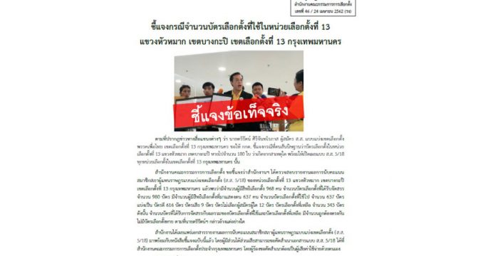 กกต. 24 เม.ย. – ศูนย์ปฏิบัติการด้านการข่าวสำนักงานคณะกรรมการการเลือกตั้ง (กกต.) ออกเอกสารชี้แจงกรณีจำนวนบัตรเลือกตั้งที่ใช้ในหน่วยเลือกตั้งที่ 13 แขวงหัวหมาก เขตบางกะปิ เขตเลือกตั้งที่ 13 กทม. ตามที่นายตรีรัตน์ ศิริจันทโรภาส ผู้สมัคร ส.ส. เขต 13 กทม. พรรคเพื่อไทย ยื่นคำร้องต่อ กกต. ขอให้ชี้แจงกรณีที่สันนิษฐานว่า บัตรเลือกตั้งในหน่วยที่ 13 หายไปจำนวน 180 ใบ เกิดจากสาเหตุใด พร้อมให้เปิดเผยเอกสารรายงานผลการนับคะแนน ส.ส.แบบแบ่งเขต (ส.ส.5/18) ทุกหน่วยในเขตเลือกตั้งที่ 13 กทม. นั้น สำนักงาน กกต. ขอชี้แจงว่า สำนักงานฯ ได้ตรวจสอบรายงานผลการนับคะแนนของหน่วยที่ 13 เขต 13 กทม. แล้ว พบว่ามีจำนวนผู้มีสิทธิเลือกตั้ง 968 คน บัตรเลือกตั้งที่ได้รับจัดสรรจำนวน 980 บัตร มีผู้มีสิทธิเลือกตั้งมาแสดงตน 637 […]
