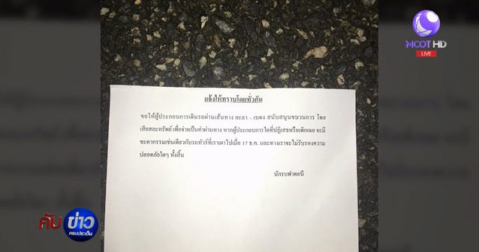 ชาวบ้านพบใบปลิวถูกทิ้งในพื้นที่ อ.บันนังสตา จ.ยะลา หลายจุด โดยระบุข้อความว่า “ขอให้ผู้ประกอบการเดินรถผ่านเส้นทาง ยะลา-เบตง สนับสนุนขบวนการ”