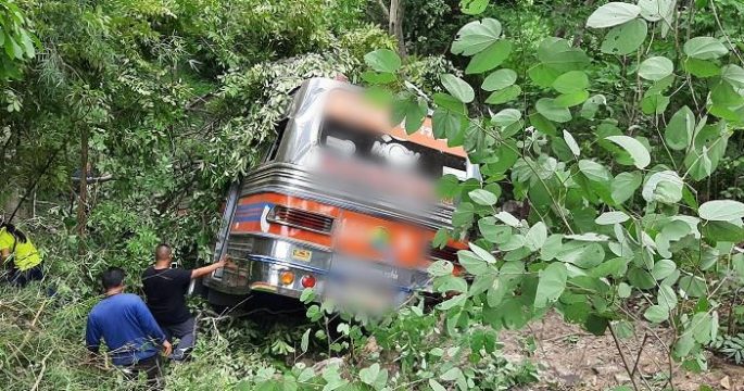 บัสทัศนศึกษาไถลข้างทางโค้งลงเขาไทรโยค