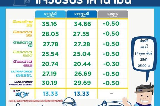 ปตท. -บางจาก ปรับขึ้นราคาขายปลีกน้ำมันทุกชนิด 50 สตางค์ต่อลิตร ยกเว้น E85 ปรับขึ้น 30 สตางค์ต่อลิตร มีผลพรุ่งนี้ (18 เม.ย. 61) เวลา 05.00 น.