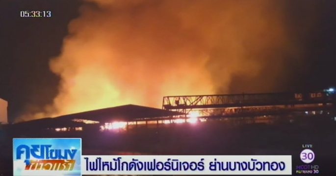 เพลิงไหม้โกดังเก็บเฟอร์นิเจอร์ย่านบางบัวทองกลางดึก เสียหายทั้งหมด ส่วนสาเหตุต้องรอเจ้าหน้าที่พิสูจน์หลักฐานเข้าตรวจสอบ