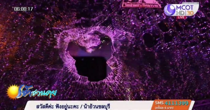หนุ่มปริศนาโผล่กลางถนนขวางรถบรรทุก 6 ล้อ ก่อนตะโกนด่าแล้วขว้างสากกะเบือทะลุกระจกหน้าโดนเด็กชายวัย 5 ขวบ ได้รับบาดเจ็บศีรษะปูดบวม