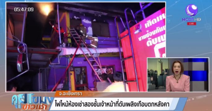 ไฟไหม้ห้องเช่า 2 ชั้น ในพื้นที่ อ.บางปะกง จ.ฉะเชิงเทรา เจ้าหน้าที่ดับเพลิงเหยียบกันสาดพังขณะปีนบันไดขึ้นไปดับไฟ จนร่างเกือบตกลงมา แต่เพื่อนคว้าตัวได้ทัน