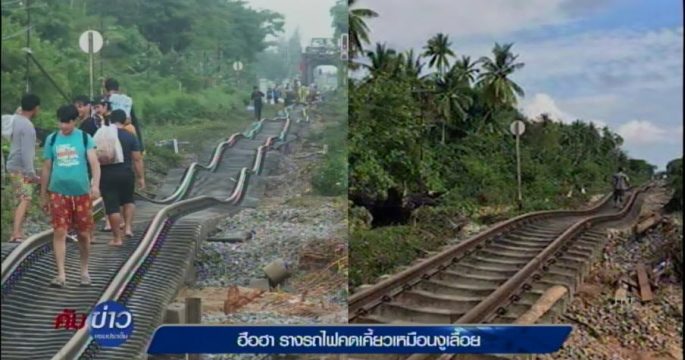 ทางรถไฟสายใต้ ช่วงตลาดบางสะพาน จ.ประจวบคีรีขันธ์ คดเคี้ยวเหมือนงูเลื้อย ในช่วงน้ำท่วม ด้านการรถไฟแห่งประเทศ เร่งซ่อมแซมราง คาดเดินรถได้พรุ่งนี้