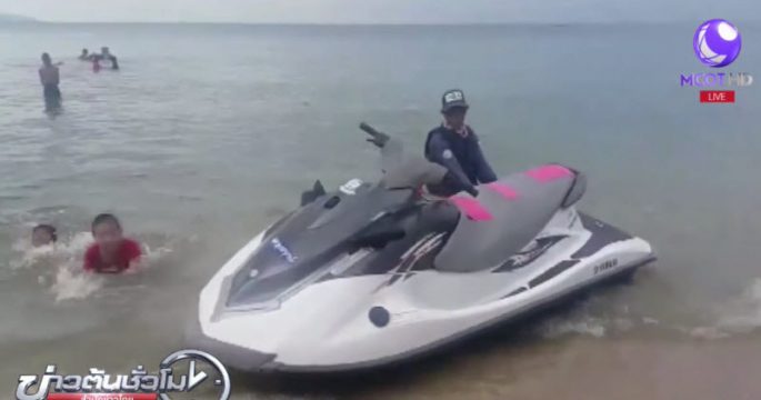 เจ้าหน้าที่เร่งนำตัวนักท่องเที่ยวสาวที่ได้รับบาดเจ็บจากอุบัติเหตุขับเจ็ตสกีชนเรือประมงที่จอดหาปลากลางทะเล บริเวณชายหาดบางแสน อ.เมือง จ.ชลบุรี ส่งโรงพยาบาล