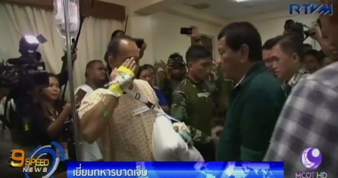 ประธานาธิบดีโรดริโก ดูเตอร์เต เยี่ยมทหารที่บาดเจ็บจากการสู้รบกับพวกมุสลิมหัวรุนแรง ที่โรงพยาบาลทหารในเมืองอีลิแกน ทางใต้ของฟิลิปปินส์