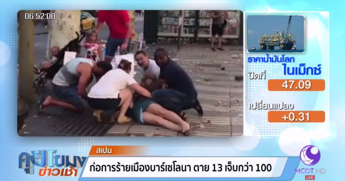 คนร้ายขับรถพุ่งชนผู้คนบนถนนย่านแหล่งท่องเที่ยวชื่อดังในเมืองบาร์เซโลนา สเปน เสียชีวิต 13 ราย บาดเจ็บกว่า 100 คน ตำรวจจับกุมผู้ต้องสงสัยได้ 2 คน
