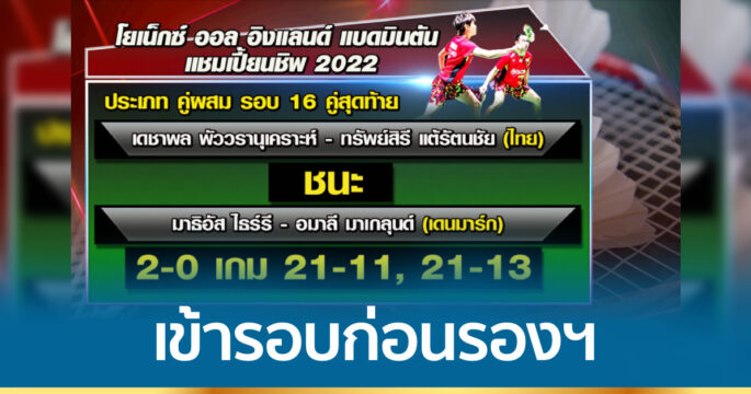 “บาส-ปอป้อ” ชนะไต้หวัน 2 เกมรวด ผ่านเข้ารอบรองชนะเลิศ การแข่งขันแบดมินตัน “โตโยต้า กาซู เรซซิ่ง ไทยแลนด์ โอเพ่น 2022” ส่วน “เมย์ รัชนก” ชนะ หวัง ซี่ยี่ สาวจีน 2 เกมรวดผ่านเข้ารอบเช่นกัน