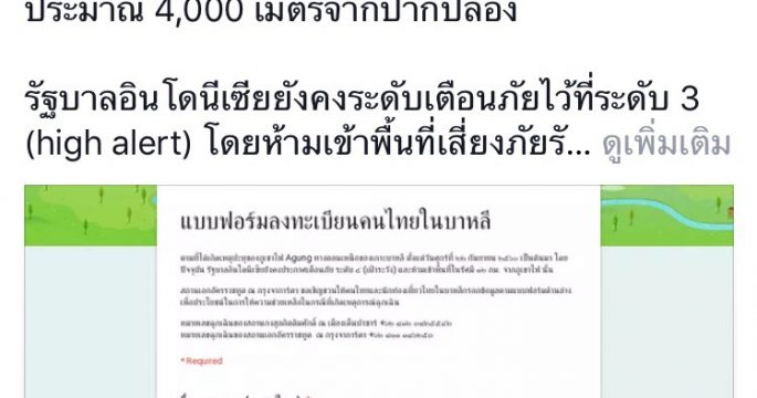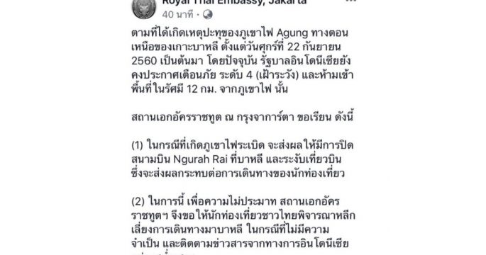 กรุงเทพฯ 25 ก.ย.- สถานทูต ณ กรุงจาการ์ตา เตือนนักท่องเที่ยวชาวไทยหลีกเลี่ยงการเดินทางมาบาหลี ในกรณีที่ไม่มีความจำเป็น และติดตามข่าวสารจากทางการอินโดนีเซียอย่างสม่ำเสมอ สถานเอกอัครราชทูต ณ กรุงจาการ์ตา โพสต์ข้อความผ่านทางเฟซบุ๊ก เตือนนักท่องเที่ยวไทยให้พิจารณาหลีกเลี่ยงการเดินทางมายังบาหลี ในกรณีที่ไม่มีความจำเป็น และติดตามข่าวสารจากทางการอินโดนีเซียอย่างสม่ำเสมอ หลังเหตุปะทุของภูเขาไฟ Agung ทางตอนเหนือของเกาะบาหลี ตั้งแต่วันศุกร์ที่ 22 กันยายน 2560 เป็นต้นมา ปัจจุบันรัฐบาลอินโดนีเซียยังคงประกาศเตือนภัย ระดับ 4 (เฝ้าระวัง) และห้ามเข้าพื้นที่ในรัศมี 12 กม. จากภูเขาไฟ เนื่องจากในกรณีที่เกิดภูเขาไฟระเบิด จะส่งผลให้มีการปิดสนามบิน Ngurah Rai ที่บาหลี และระงับเที่ยวบิน สำหรับกรณีที่คนไทยได้รับผลกระทบจากเหตุภูเขาไฟ สามารถติดต่อหมายเลขฉุกเฉินของสถานกงสุลกิตติมศักดิ์ ณ เมืองเด็นปาซาร์ +62 812 3825542 และหมายเลขฉุกเฉินของสถานทูตฯ +62 811 186253 ได้ตลอด 24 ชม. .- สำนักข่าวไทย