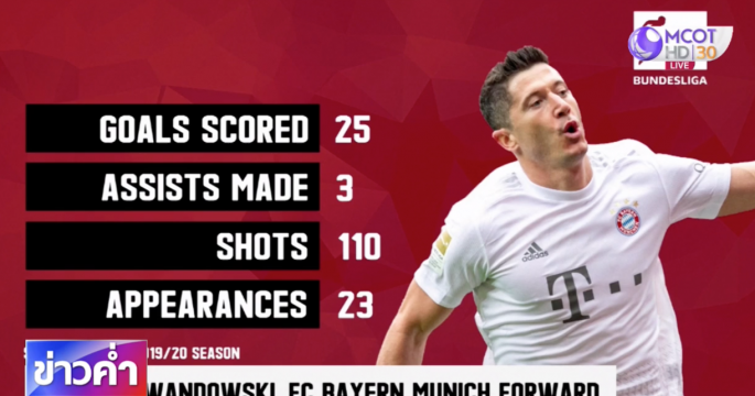 ลาท้ายข่าวกีฬาวันนี้ ไปดูช็อตยิงอันยอดเยี่ยมของโรเบิร์ต เลวานดอฟสกี้ ดาวยิงตัวเก่งของบาเยิร์น มิวนิค ที่ทำประตูโทนเอาชนะแวร์เดอร์ เบรเมน ทำสถิติยิงประตูได้มากสุดต่อฤดูกาล
