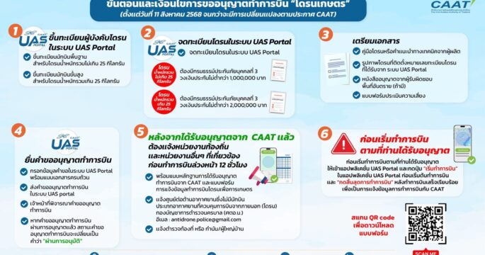 ทำเนียบ 16 ส.ค.-ศบ.ทก. ยืนยันรับรายงานจาก กพท.ผ่อนปรนให้บินโดรนทุกประเภทได้ ยกเว้นพื้นที่ห้ามบินด้านความมั่นคง หากพบเห็นระวังโดนสอย นายจิรายุ ห่วงทรัพย์ คณะกรรมการศูนย์เฉพาะกิจบริหารสถานการณ์ชายแดนไทย–กัมพูชา (ศบ.ทก.) เปิดเผยว่า สำนักงานการบินพลเรือนแห่งประเทศไทย (กพท.)ผ่อนปรนให้บินโดรนทุกประเภท ภายใต้เงื่อนไขที่กำหนด ตั้งแต่วันนี้ 16-31 สิงหาคม 2568 หรือจนกว่าจะมีการเปลี่ยนแปลง คณะกรรมการศูนย์เฉพาะกิจบริหารสถานการณ์ชายแดนไทย–กัมพูชา (ศบ.ทก.) ได้รับแจ้งจาก กพท. ว่าได้ออกประกาศอนุญาตให้ทำการบินหรือปล่อยอากาศยานซึ่งไม่มีนักบิน (โดรน) ทุกประเภทได้ ภายใต้เงื่อนไขพื้นที่ห้ามบิน ตั้งแต่วันนี้ 16 – 31 สิงหาคม 2568 หลังจากได้ขอความร่วมมืองดบินในช่วงวันที่ 30 กรกฎาคม – 15 สิงหาคม 2568 ที่ผ่านมา เพื่อป้องกันความเสี่ยงด้านความมั่นคงและความปลอดภัยของประเทศ จากสถานการณ์ความไม่สงบบริเวณชายแดนไทย–กัมพูชา ซึ่งอาจส่งผลกระทบต่อการปฏิบัติงานของเจ้าหน้าที่ฝ่ายความมั่นคงในพื้นที่ต่าง ๆ ทั้งนี้มีเงื่อนไขสำคัญ ดังนี้ 1.โดรนทุกประเภทสามารถทำการบินได้ ยกเว้นในพื้นที่ห้ามบิน ผู้ใช้งานสามารถตรวจสอบพื้นที่อนุญาตได้ที่แอปพลิเคชัน UAS Portal 2.โดรนทุกประเภทต้องแจ้งข้อมูลการบิน (พื้นที่ที่ปฏิบัติการบิน […]