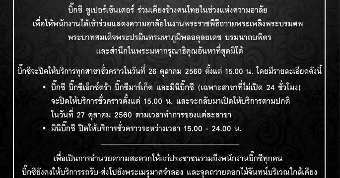 กลุ่มบิ๊กซีปิดให้บริการทุกสาขาชั่วคราว 26 ต.ค. ตั้งแต่เวลา 15.00 น. พร้อมให้บริการรถรับ-ส่งไปพระเมรุมาศจำลองและจุดถวายดอกไม้จันทน์ทั่วประเทศ