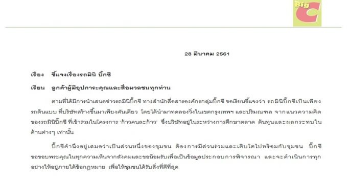 บิ๊กซีชี้แจง รถมินิบิ๊กซี เป็นรถต้นแบบที่ทดลองวิ่งในเขตกรุงเทพฯและปริมณฑล โดยมีเพียงคันเดียวและอยู่ระหว่างศึกษาด้านต่าง ๆ