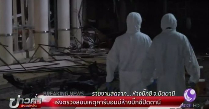 เหตุระเบิด 2 จุดที่ห้างบิ๊กซีกลางเมืองปัตตานี ล่าสุดผู้บาดเจ็บเพิ่มเป็น 51 คน สาหัส 2 คน โดยห้างปิดบริการแล้ว ขณะที่ชุดอีโอดีและ พฐ.เข้าเคลียร์พื้นที่ และปิดกั้นพื้นที่โดยรอบ เบื้องต้นพบป้ายทะเบียนรถก่อเหตุคาร์บอมบ์เป็นป้ายทะเบียนปลอม