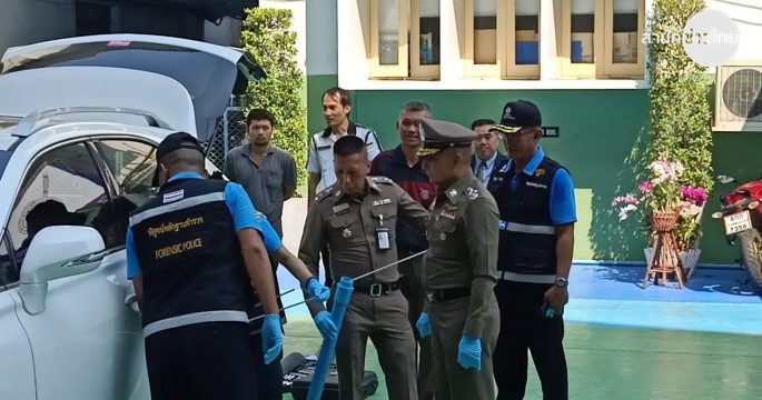 เจ้าหน้าที่พิสูจน์หลักฐานและผู้เชี่ยวชาญ เข้าตรวจหาวัตถุพยานและร่องรอยหัวกระสุนในรถยนต์ “บิ๊กโจ๊ก” ที่ถูกคนร้ายลอบยิง
