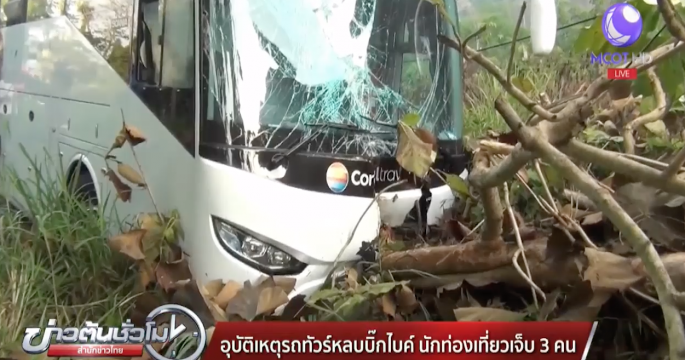 เกิดเหตุรถทัวร์พุ่งชนต้นไม้ นักท่องเที่ยวบาดเจ็บ 3 คน คนขับรถทัวร์ เล่าว่า เดินางมาจากภูเห็ตเพื่อมาส่งนักท่องแต่ระหว่างทางมีบิ๊กไบค์ขับแข่งกันมา 3 คัน คันหนึ่งได้ขับปาดหน้ารถตนจึงทำให้เสียหลักพุ่งลงข้างทาง